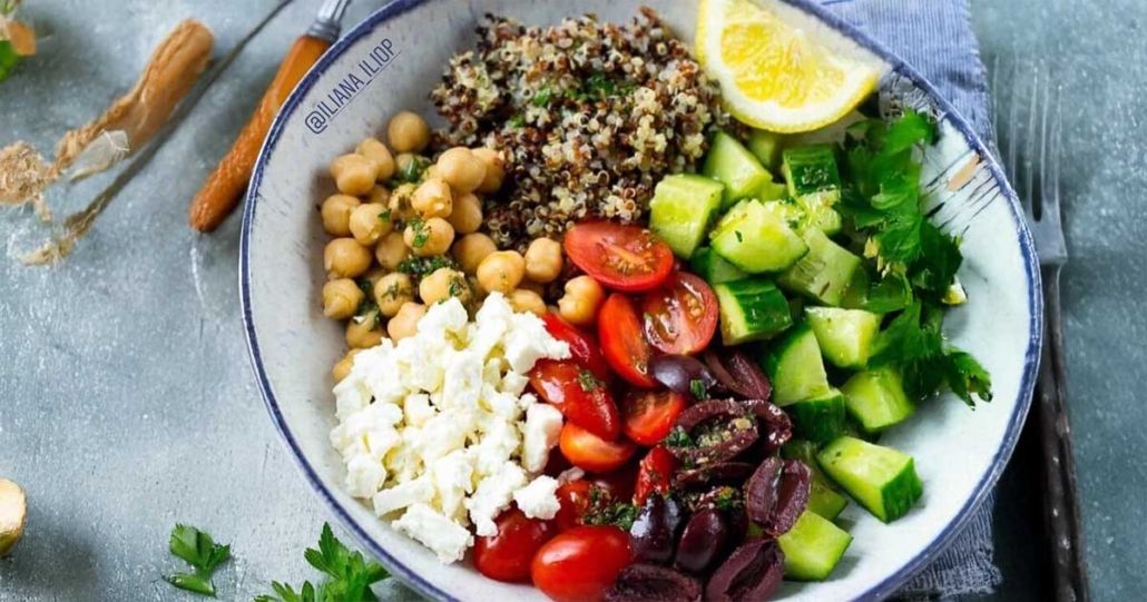 ✍️Περιλαμβάνει ρεβίθια βραστά (γίνεται άνετα και με φακές), κινοα (γίνεται άνετα και με πλιγούρι/φαγοπυρο), τυρί φέτα, ελιές και λαχανικά τύπου χωριάτικης!